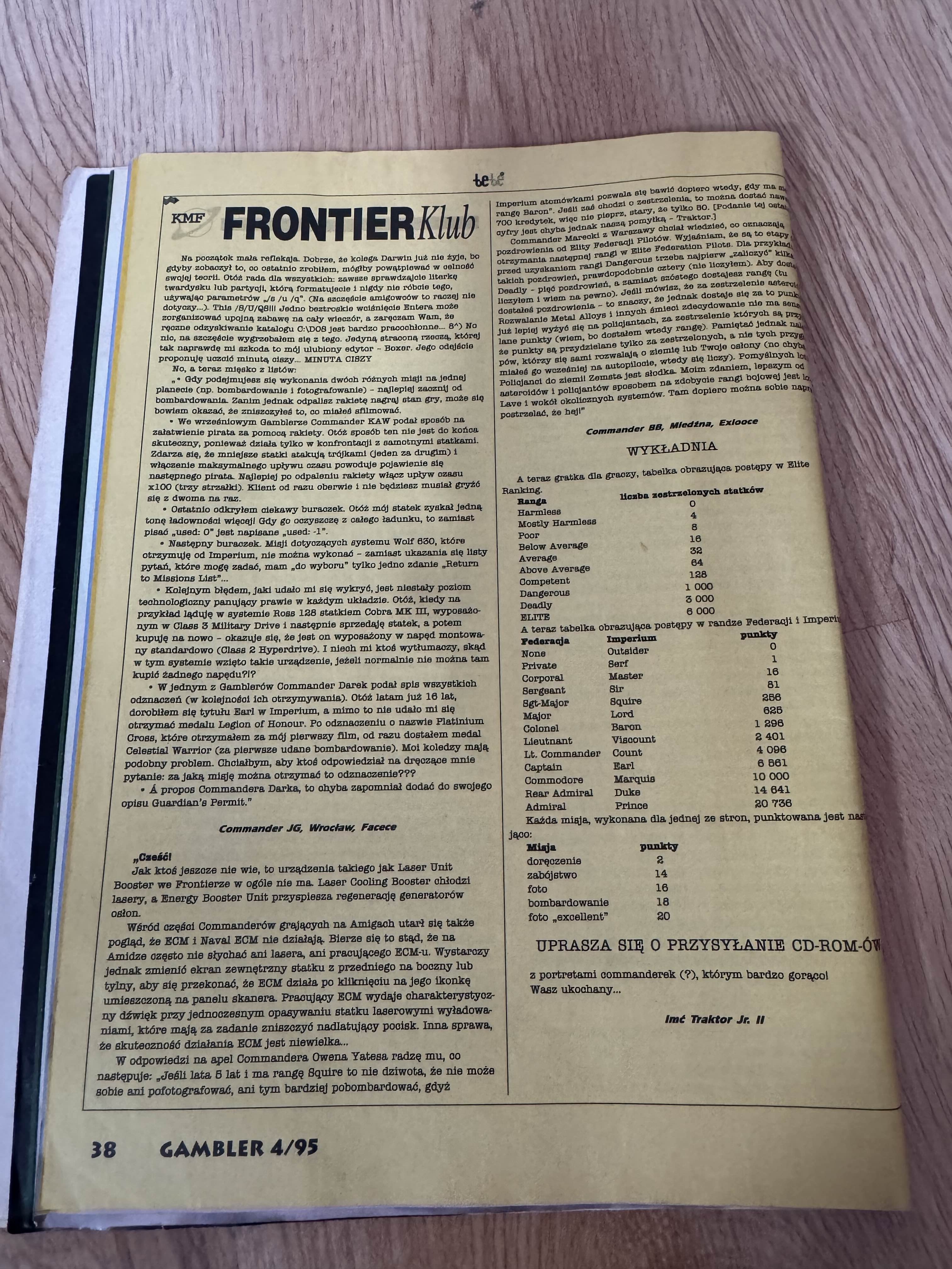 Some pages from Gambler magazine issue 4/95 with a Frontier Club article containing various tips for the game, as well as a list of requirements to achieve all ranks. Useful!