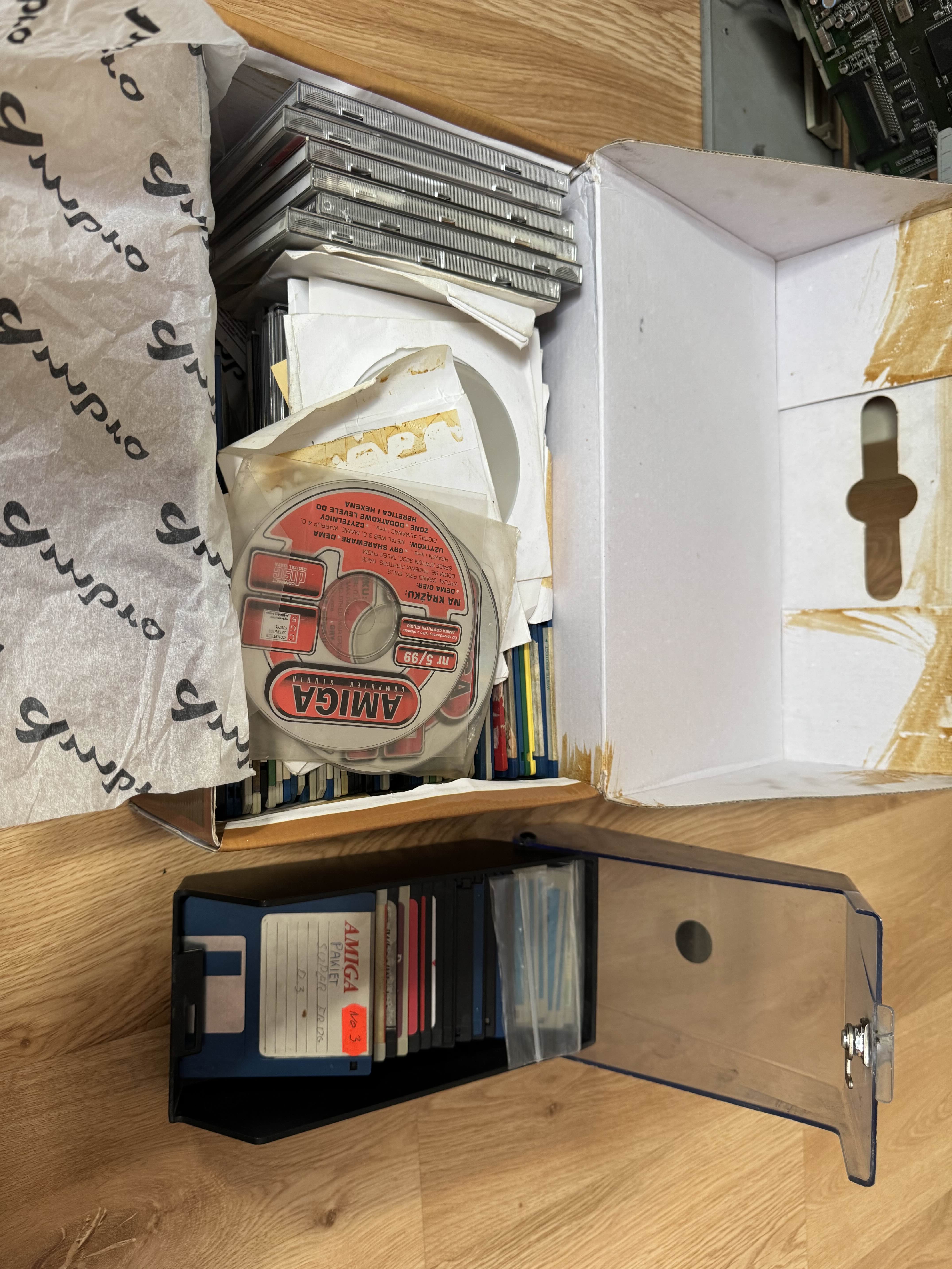 A box of treasures! CDs from old Amiga magazines, floppies with games and utilities, and some CDs compiled by my brother - I don't even remember what's there!
