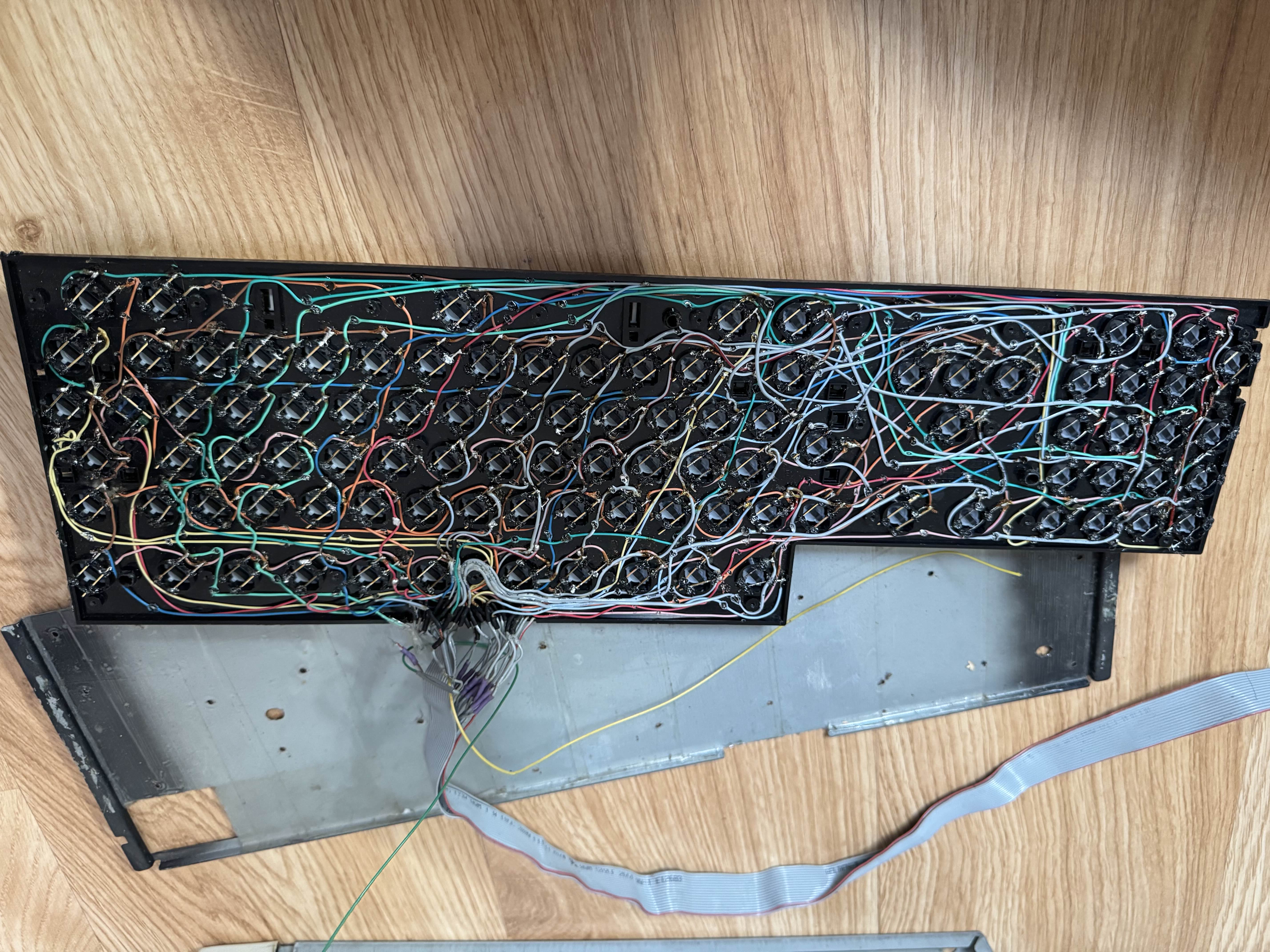 The underside reveals that the keyboard has been completely remade by hand so that it could be attached with a ribbon cable to the external keyboard port on the computer. It probably still works, but there is no way to put it back inside the case.