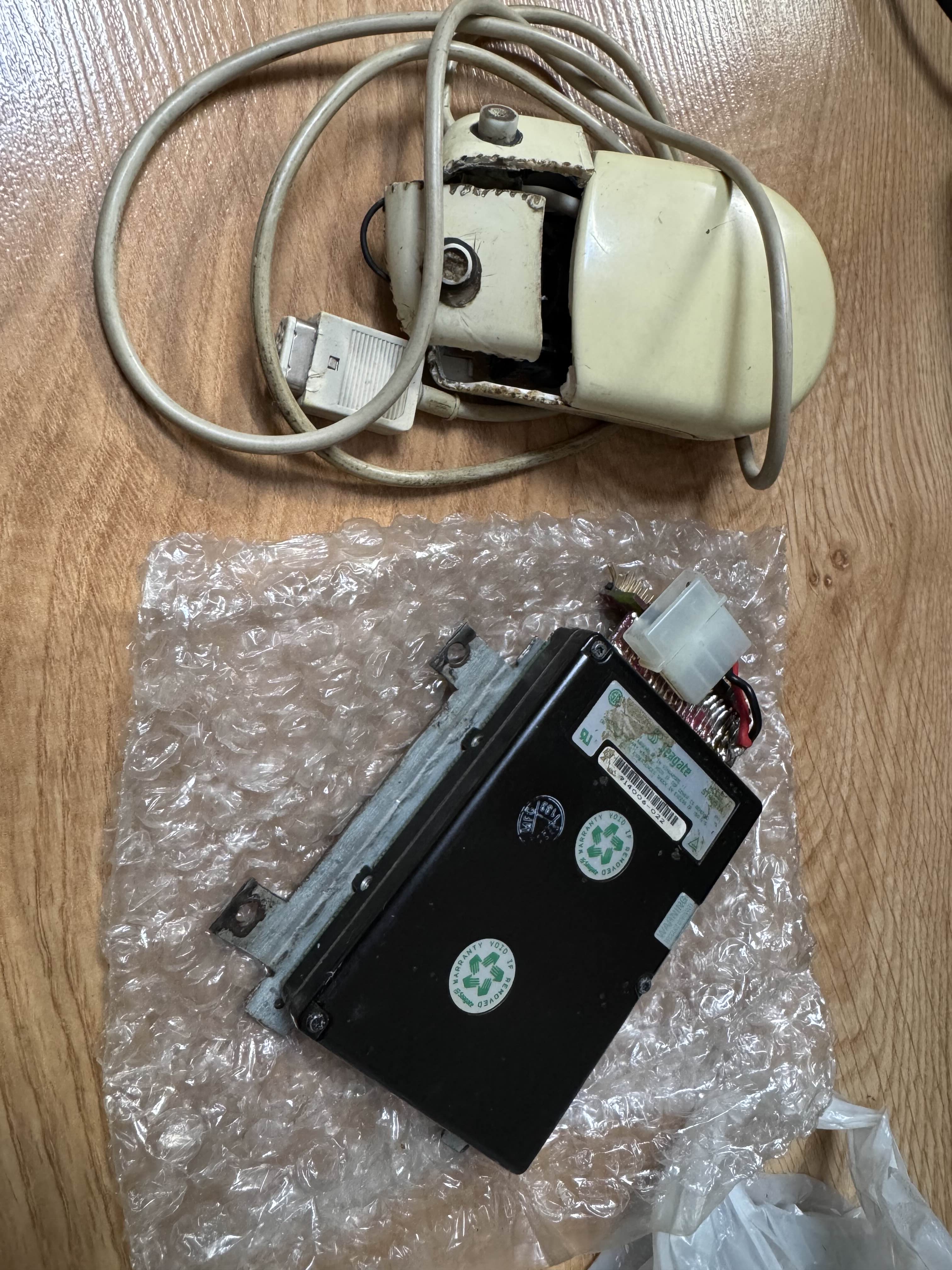 Here we can see some old, mostly broken extra pieces of hardware. Buttons on the mouse broke, then were hand-remade with keyboard switches, then broke again. It is possible that the electronics still work and could be used again, if the buttons are somehow fixed.